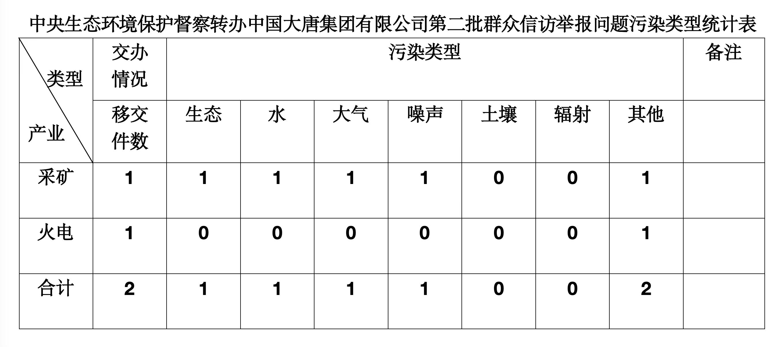 2025年6月4日,中央第七生態(tài)環(huán)境保護督察組向中國大唐集團有限公司移交第二批群眾信訪舉報件,共計2件,來電舉報和來信舉報各1件,涉及生態(tài)問題1個、水問題1個、大氣問題1個、噪聲問題1個、其他問題2個。所有舉報件辦理工作已第一時間進入調(diào)查核實辦理程序,辦理情況將按照相關(guān)要求反饋督察組,并及時向社會公開。
